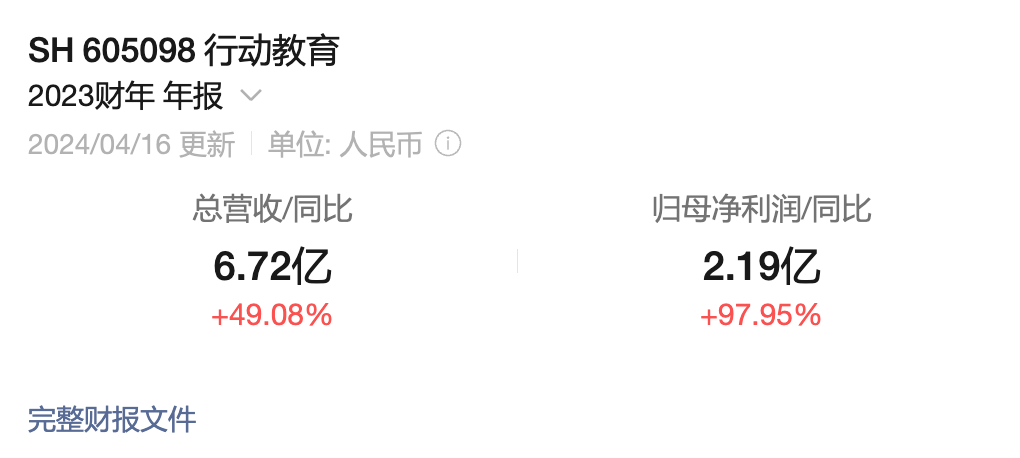 2023年,行动教育的营收同比增长49.08%,归母净利润同比增长97.95%;