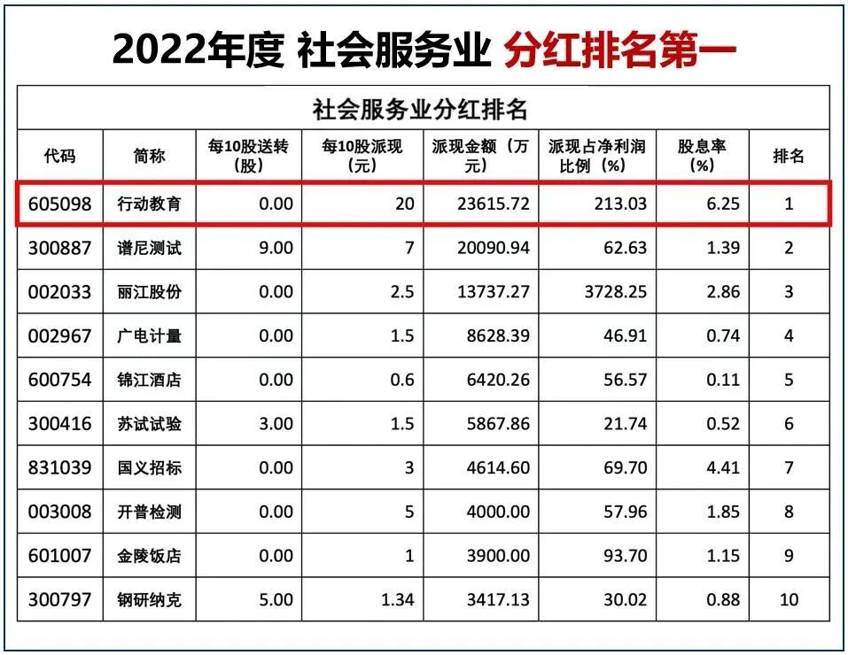 2022年,行动教育以扣非净资产收益率与销售毛利率等数据,成为“2022年度教育行业盈利能力排名第一企业”,盈利能力领跑行业,也以派现金额最多,成为A股市场中“2022年度社会服务业分红排名第一企业”,持续以高价值回报社会。