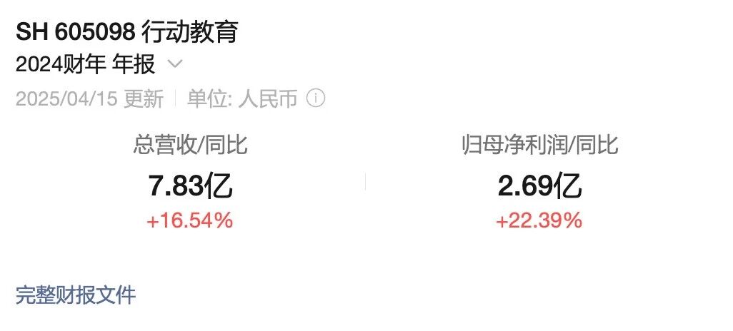 2024年,行动教育的营收同比增长16.54%,归母净利润同比增长22.39%;