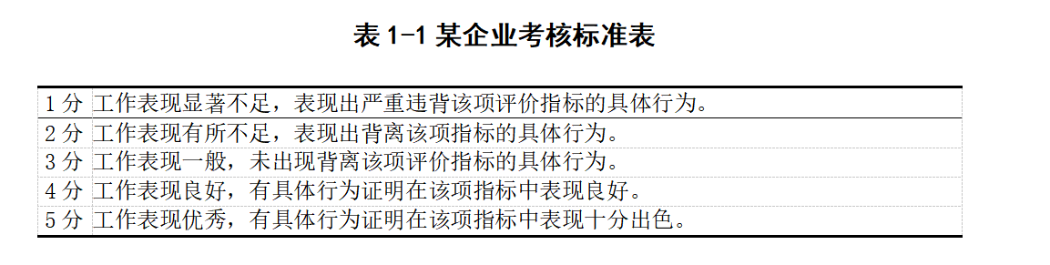 某企业考核下属员工工作表现,采取5分制考核标准,不同分值代表不同的工作表现(见表1-1)。