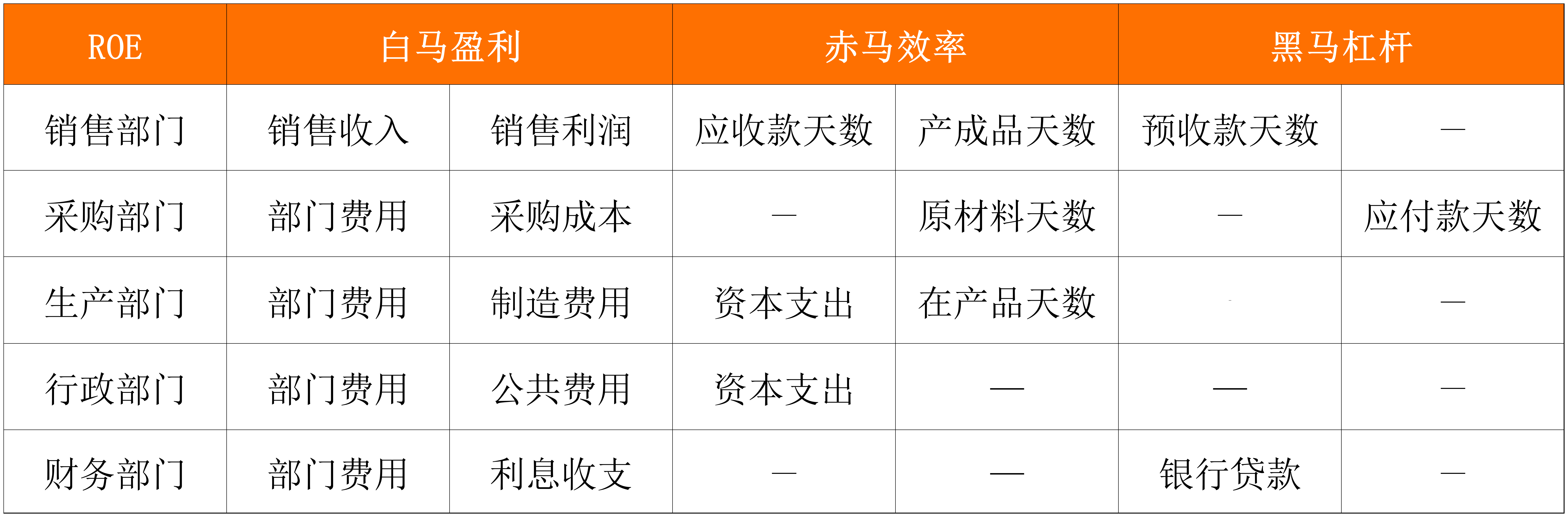 以我的观察来看,大部分企业的销售部门只对白马盈利进行管理,而没有站在经营者的角度同时对赤马效率和黑马杠杆进行管理。只有从三驾马车的维度对ROE指标进行分解,企业才能真正实现人人都是经营者。