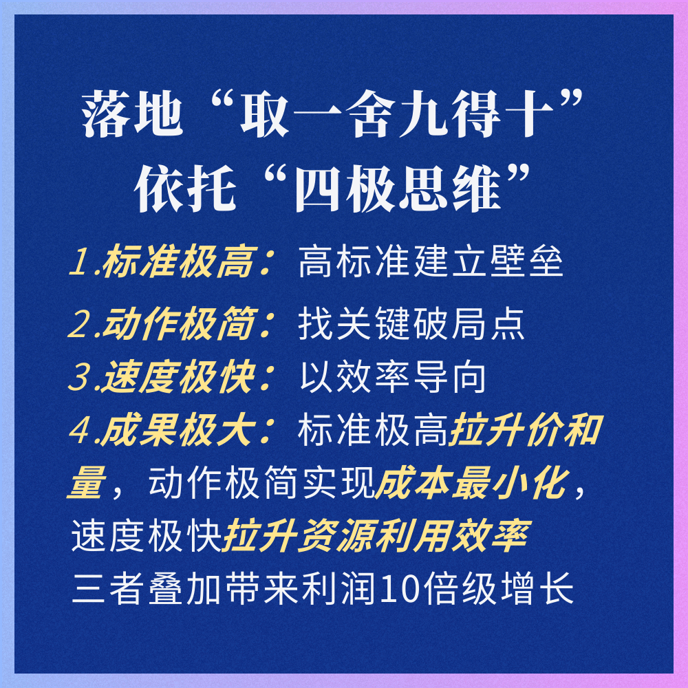 当然,要落地“取一舍九得十”,还需要依托一套系统化方法论——四极思维,即标准极高、动作极简、速度极快、成果极大,这四大维度相互支撑,构成一个完整的行动闭环。