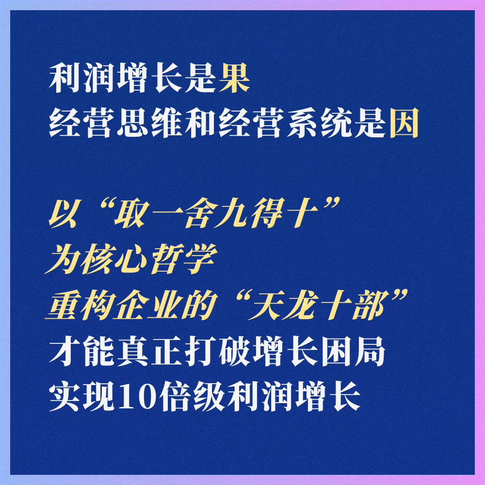 因为“取一舍九得十”是启动“天龙十部”的钥匙——只有在十大模块中全面贯彻“取一舍九得十”的经营哲学,才能真正完成企业经营系统的重构,最终实现十倍级利润增长。