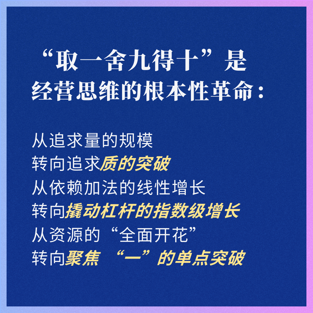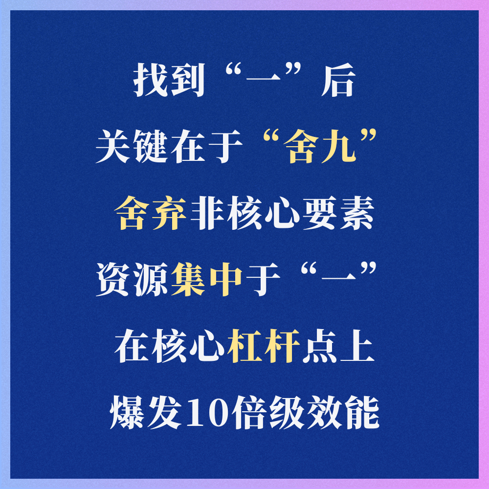 找到“一”后,关键在于“舍九”——将所有时间、精力、资源从非核心要素中抽离,全部聚焦到“一”上。“舍九”的本质是极简思维——企业的时间、精力和资源有限,任何分散在非杠杆点的投入都是浪费。只有果断舍弃非核心要素,将资源全部集中于“一”,才能在核心杠杆点上爆发出十倍级效能。