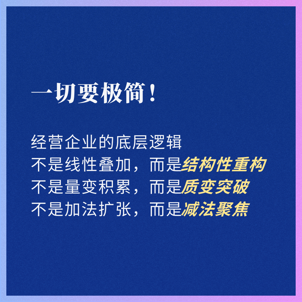事实上,经营企业的底层逻辑不是线性叠加,而是结构性重构;不是量变积累,而是质变突破;不是加法扩张,而是减法聚焦。企业真正需要的不是更多的产品、更多的客户、更多的员工,而是更少的产品、更少的客户、更少的员工……一切都要极简。因为只有做减法,才能从根本上改变成本结构,重塑利润公式的结构。