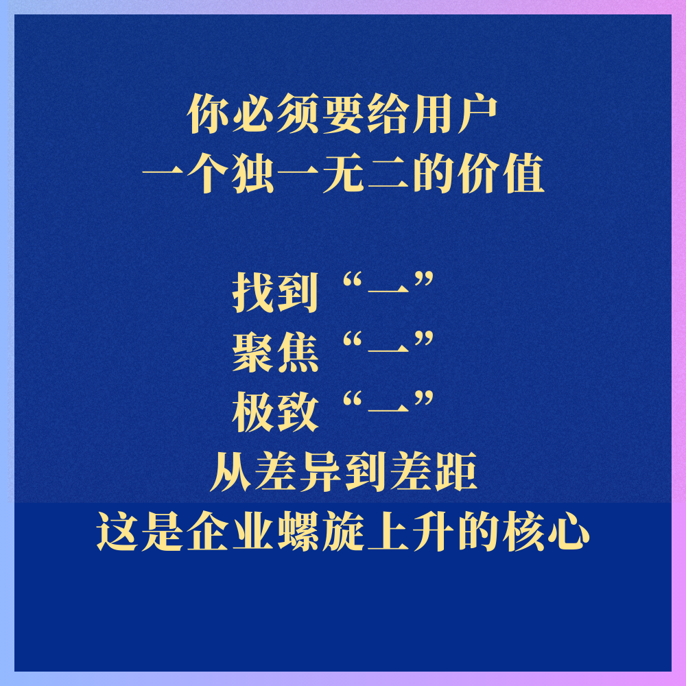 在用户心目中,你等于什么?这是经营企业,必须回答的一个问题。做企业,你必须要给用户一个独一无二的价值。你必须清晰地告诉用户:和其他公司比,你独一无二的绝活儿是什么?然后找到“一”,聚焦“一”,极致“一”,从差异到差距,这是企业螺旋上升的核心。