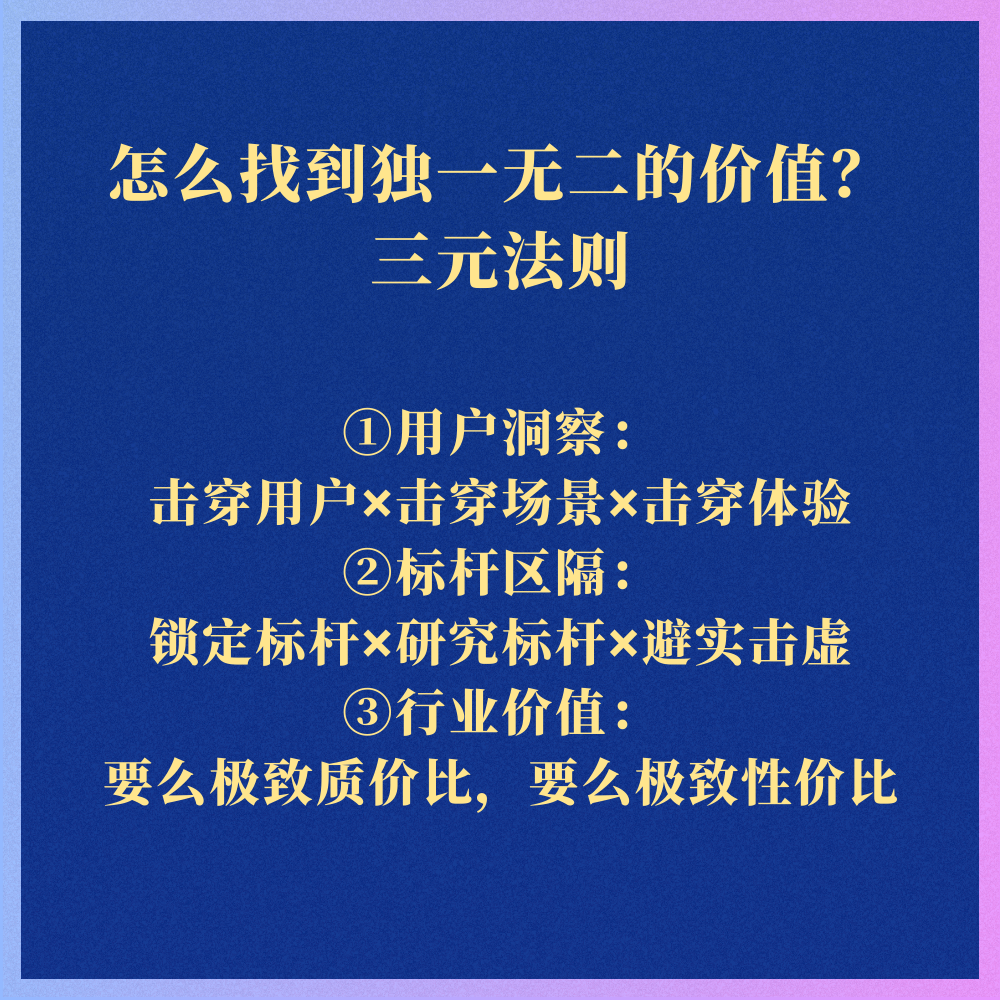 怎么才能找到自己独一无二的价值锚呢?我们从实践中提炼出一套方法论——“三元法则”。从用户洞察、标杆区隔和行业价值3个维度来思考,三者的交叉点就是企业独一无二的价值锚点,也就是用户的买点。
