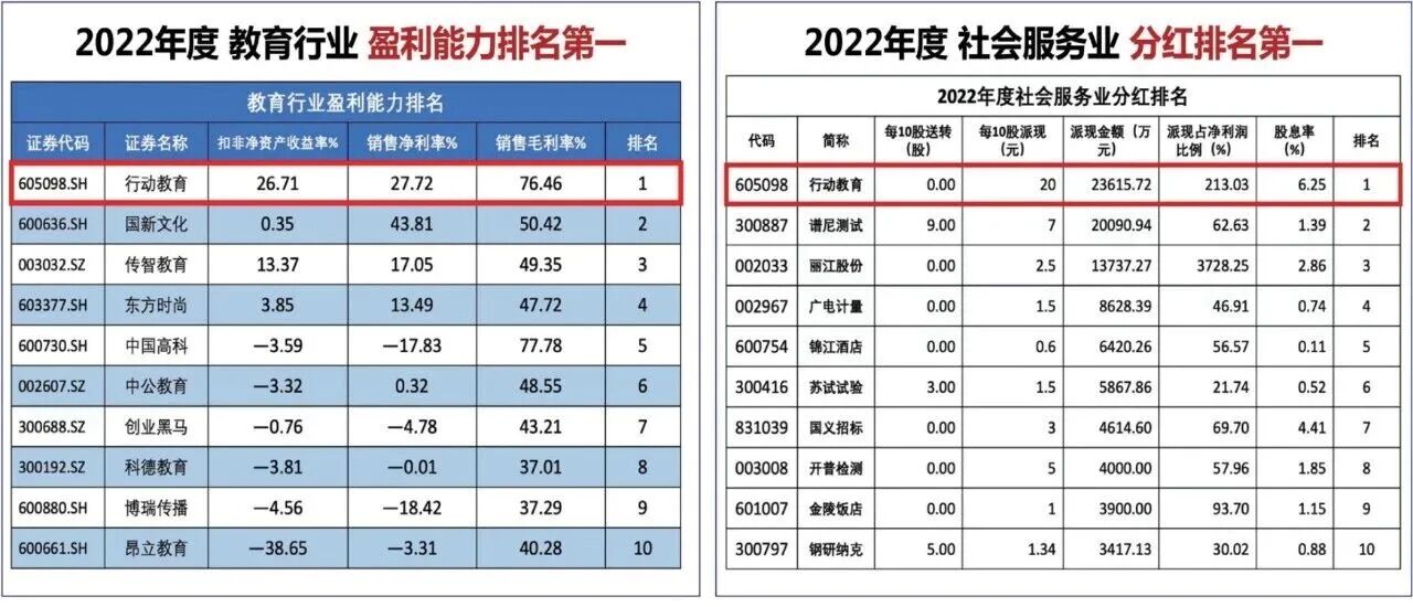 与此同时,行动教育的盈利质量持续提升,现金流充裕,高比例分红,主业的韧性与经营的效率显著增强,也因为这些实打实的经营表现,这5年期间,行动教育先后被评为“教育行业盈利能力排名第一企业”“社会服务业分红排名第一企业”“在中国管理咨询机构50大名单上,排名第一的企业”“在上市公司现金分红榜单上,位列教育行业第一的企业”等。