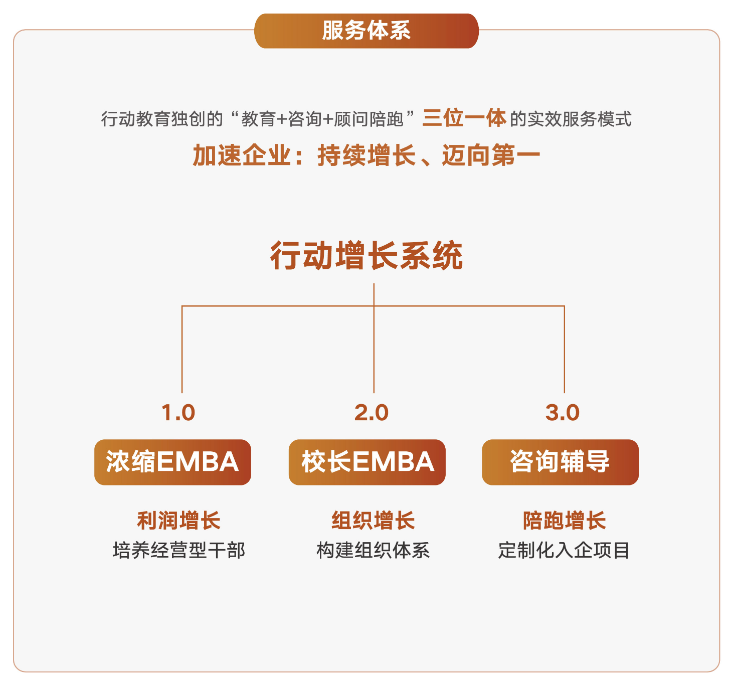 为了加速校友企业持续增长、迈向第一,行动教育开创性构建“教育+咨询+顾问陪跑”三位一体的实效服务模式
